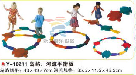 特点:由4个岛屿、12条河流组成,共16件.幼儿淌过"河流"登上"岛屿",做一次冒险的旅行真有趣.训练肢体平衡能力.